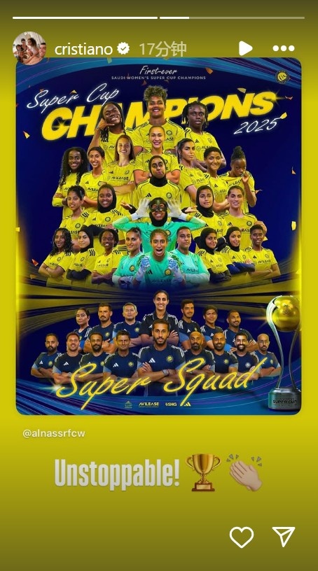 赛后,利雅得胜利男足球员C罗更新社媒为利雅得胜利女足送上祝福,他晒出夺冠海报,同时配文:势不可挡!