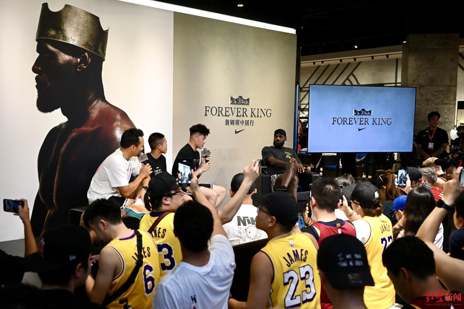 在门店内的粉丝见面会上,还有成都球迷送给詹姆斯一顶“青铜皇冠”,上面有成都城市形象标识太阳神鸟的图案。詹姆斯接过皇冠,饶有兴趣地打量一番后,将其戴在了自己的头顶,这也契合了本次活动的主题“Forever King”(永远的国王)——在詹姆斯的球迷心目中,这位NBA巨星用篮球天赋和坚韧不屈的精神,从被寄予厚望到最终成为篮球场上的永恒国王!