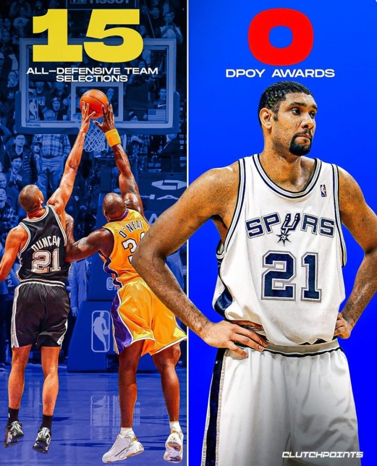 然而,在邓肯整个职业生涯中,他从来没有获得过最佳防守球员奖,他在最佳防守球员的评选中最多排在第三。